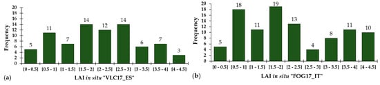 ESUs frequency histogram classified for LAIgreen value range, for (a) the VLC17_ES testing dataset and (b) the FOG17_IT validation dataset. Bare soil ESUs are not included.
