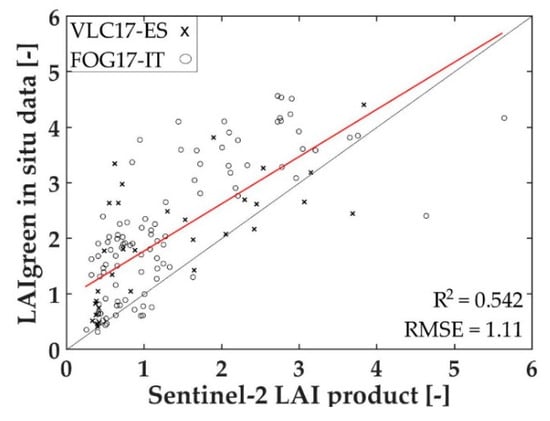 The LAIgreen products of both Valencia and Foggia Sentinel-2 images were obtained and compared with the in situ LAIgreen of the corresponding pixel. The analysis was carried out with only 31 LAIgreen VLC17_ES values and 99 FOG17_ES values, because only those corresponding pixels indicated with a good product quality flag were selected. Figure 4 shows the Sentinel-2 LAIgreen product values and the in situ LAIgreen values, with the 1:1 line (black), its statistics and the linear fitting (red). A clear underestimation of the product values is shown in Figure 4.