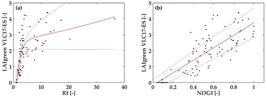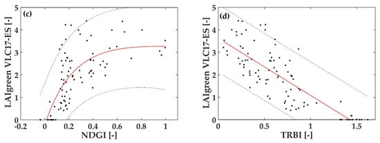 Graphic representation of the LAIgreen of VLC17_ES dataset as a function of the established LAIgreen indices, with the best fitting function and 95% of confidence interval. (a) RI []; (b) NDGI []; (c) NDGI []; (d) TRBI [].