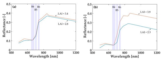 Another demonstration of the saturation produced by the band located at the red region (B4: 665 nm) is Figure 6. In this Figure, real Sentinel-2 spectra of artichoke (LAI = 2.8 in blue, 3.4 in orange) and orange tree crops (LAI = 2.3 in blue, 3.9 in orange) with moderate-high LAIgreen values of the VLC17_ES dataset are represented. Values higher than 2 have been chosen because it is usually the limit at which saturation process starts with common LAIgreen indices (Figure 5). As can be seen, they have the same reflectance value in the 665 nm band, that is, at moderate-high LAIgreen values, chlorophyll maximally absorbs in this region, producing saturation. At the same time, the red-edge band close to the red (B5: 705 nm) does not show such entire absorption saturation, which brings the advantage of using red-edge Sentinel-2 bands for LAIgreen estimation.