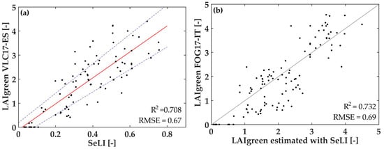 (a) Graphic representation of the LAIgreen of the testing VLC17_ES dataset (n = 92) as a function of SeLI, the index proposed, with linear fit and 95% of confidence interval, (b) LAIgreen in situ validation data from FOG17_IT (n = 109) as a function of LAIgreen estimated with SeLI, with 1:1 line and its statistics.