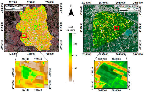 Finally, we applied the SeLI to both field sites, using the 26 May 2017 and 8 April 2017 Sentinel-2 images for the Huerta of Valencia and Foggia site, respectively. The resulting maps are shown in Figure 8, demonstrating the applicability of SeLI at high spatial resolution for two distinct agricultural areas. In brown, the pixels with the lowest value of LAIgreen are shown, mainly corresponding to bare soils, and in green colour, the pixels with the highest LAIgreen value, corresponding to potato and alfalfa crops in the case of Valencia, and wheat in the case of Foggia. A zoom of each map is shown to demonstrate the high spatial resolution of Sentinel-2, being able to observe individual agricultural plots of 40 m × 40 m (Valencia) and 100 m × 100 m (Foggia) based on LAI, while also observing slight LAI variability within these plots.