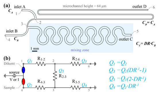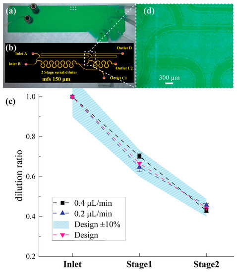 Almost every quantitative chemical and biological assay relies heavily upon accurate and prompt serial dilution. Its usefulness lies in the fact that with a suitable sample preparation procedure, a wide variety of known scaled concentration samples can be generated using a suitable diluent [1]. For example, widely known quantitative assays, such as real time polymerase chain reaction (q-PCR) or antigen assays, e.g., Enzyme-Linked Immunosorbent Assay (ELISA), require serial dilutions of a known analyte to produce several reference calibration signals which can be later used for standard or calibration curves. Over the last 15 years, many continuous-flow microfluidic dilution devices have been proposed for the generation of multiple stepwise concentrations or concentration gradients with logarithmic [2,3] or linear [4,5,6,7] dilution. However, the majority often requires multiple flow sources (pressure or flow rate) to be employed for driving fluids through the device. Their operation could be potentially unstable and they may be hard to handle [8] and integrate with other components in a monolithic manner.