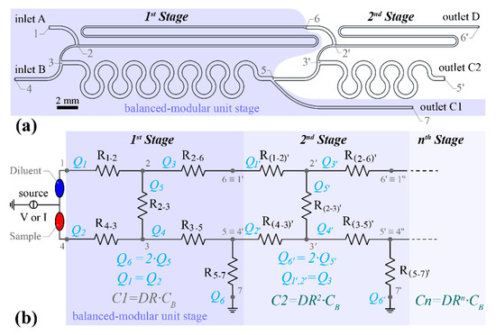 The two-stage stepwise serial diluter of the PCB based device (a) design overview highlighting the balanced modular unit stage (b) electrical analogous resistor-base network of an n-stage serial diluter design. The dilution ratio per stage is DR = 2:3.
