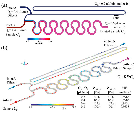 The concentration field in Figure 3a verifies that the six double-loop micromixing channel has adequate length to achieve uniform mixing at the device outlet. In Figure 3b the pressure field along the device with flow rate 0.4 μL/min is shown. The coloured iso-pressure lines illustrate the positions experiencing equal pressure values. In addition, the table presented in Figure 3b summarises the pressure at the inlet surfaces for various flow rates. Evidently, the pressure balanced optimised design results in equal pressure formation on both inlets for every simulated flow rate. More specifically, the nominal inlet flow rate (0.4 μL/min) through both inlets generates 85.2 Pa. This order of pressure magnitude can be easily provided by a burst blister packaging. Furthermore, the pressure created on both inlet surfaces increases in proportion to the flow rate while remaining equal. Consequently, this design offers dilution rate performance that is tolerant of flow source fluctuations. However, as indicated in the table of Figure 3b, for flow rates higher than 0.6 μL/min the ME drops (ME = 0.98 for QA,B = 0.8 μL/min).