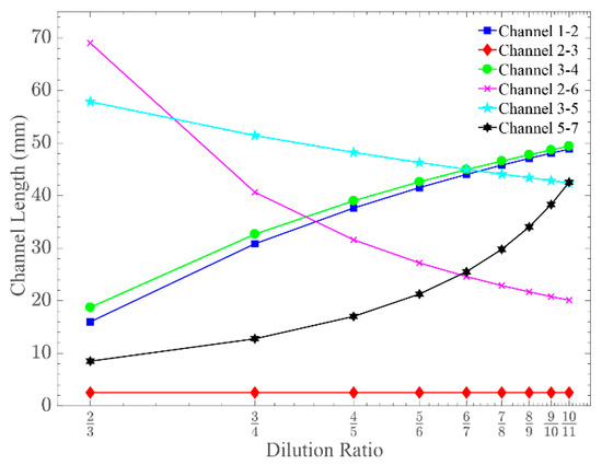 The design rules of the pressure and flow rate balanced modular unit cell showing the required microchannel lengths for various dilution ratios. Microchannel widths are kept the same as the optimised modular unit cell-generating dilution ratio of 2:3.