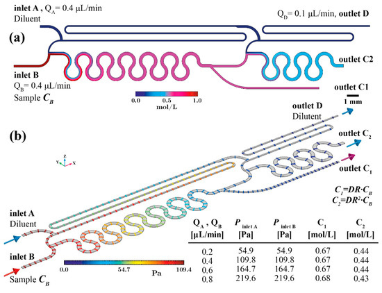 Consequently, the dilution ratio is affected for both outlets. In detail, for the case of 0.8 μL/min inlets flow rate, the resulting C1 outlet sample concentration is C1 = 0.68 mol/L. Thus, the generated dilution ratio is 0.68 instead of 0.67, which is the design dilution ratio of both stages (C1 = 2:3 CB or 0.67 CB). This minor deviation is attributed to the fact that the sampling microchannel (see Figure 2a, between pos. 5–7) at position 5 is placed on the same side as the sample inlet (inlet B). As a result, the non-uniformly generated diluted sample gives a higher concentration on the inlet B side. The 2nd stage is provided with lower concentration inlet sample and the diluted sample through outlet C2 presents lower concentration (i.e., C2 = 0.43 mol/L instead of 0.44 mol/L in case of nominal inlet flow rate).