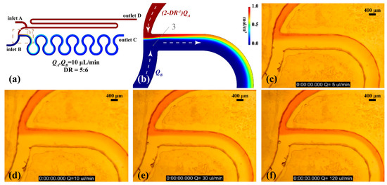 A solution of DI water and food colouring was used as inlet A fluid while DI water was driven through inlet B. Both flow rates were equal and were achieved by using a syringe pump loaded with two 10 mL plastic syringes. As illustrated in Figure 6d, the simulation result is in agreement with the former (Figure 6b). Comparing the two figures, it can be observed that the ratio between the red and the blue stream in Figure 6b is approximately equal to the ratio between the two streams in the experimental results (Figure 6d). Figure 6c–f illustrate the stable dilution ratio of the unit cell for a wide range of flow rates confirming the theoretical model since the ratio between the two stream widths is exactly the same in every image.
