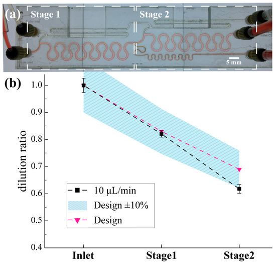 Dilution ratio validation of the two-stage PMMA prototype using commercial Accu-Check® glucose meter. MFS 430μm (a) The prototyped two-stage PMMA diluter during performance validation experiment. Channel height is 275 μm (b) The solid marks represent the dilution performance under 10 μL/min flow rate.