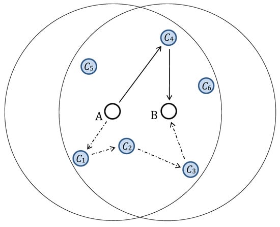 Two paths selected for a key update transmission from node A to node B. The solid lines mark a delivery path with a single selected intermediate node, , and the dash-dotted lines mark a delivery path with three intermediate nodes, , , and .