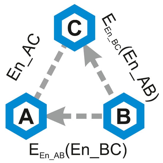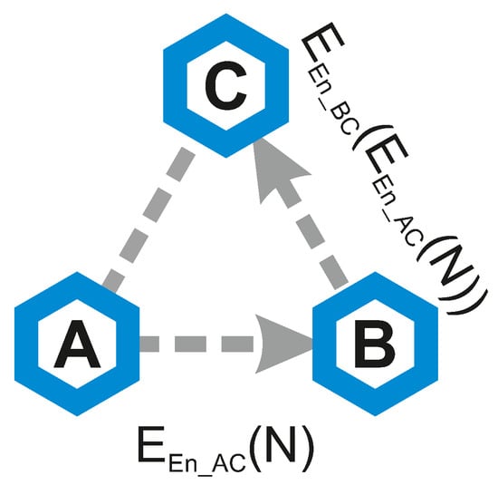 Facing the issue of low entropy levels produced by the key extraction alone, in [4], we proposed two approaches to combining entropy over multiple links. These two protocols are inspired by the classical secrecy amplification protocol versions—Push and Pull. Both are described on a small subset network, composed of only three nodes—A, B, and C. We assume that all three links in between these three nodes had collected RSS measurements and successfully computed three bitstrings (noted as ), shared in between individual pairs of nodes. However, the min-entropy of any of these bitstrings does not exceed a set threshold required for a secure key For example, nodes A and B had produced a shared bitstring, but the min-entropy of such bitstring does not exceed 40 bits. Inherently, the bitstring alone cannot be used to secure the link directly.