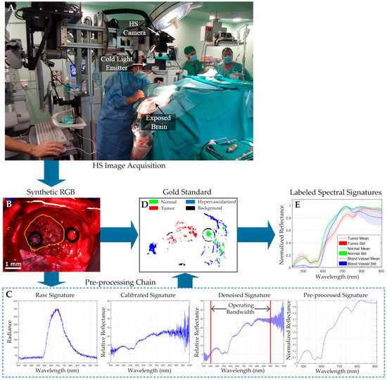 (A) Intraoperative hyperspectral (HS) acquisition system capturing an image during a surgical procedure. (B) Synthetic red–green–blue (RGB) representation of an HS cube from an in vivo brain surface affected by glioblastoma (GBM) tumor (outlined in yellow). (C) Input and output spectral signatures of each step of the pre-processing chain employed to pre-process the HS cube. (D) Gold standard map obtained with the semi-automatic labeling tool from the HS cube. Normal, tumor, hypervascularized and background classes are represented in green, red, blue, and black color, respectively. White pixels correspond with non-labeled data. (E) Average and standard deviation of the spectral signatures of the tumor (red), normal (green), and blood vessel/hypervascularized (blue) labeled pixels.