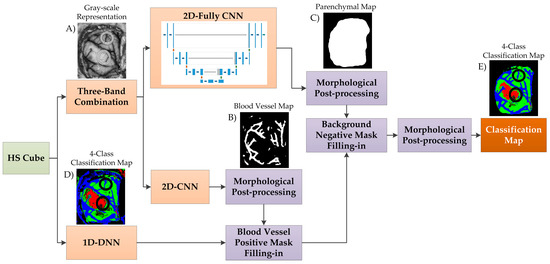 In the third step, the HS cube is classified by the 1D-DNN obtaining a four-class classification map (Figure 2D) where the preliminary classification of the normal tissue, tumor tissue, blood vessels/hypervascularized tissue, and background is performed. Then, the blood vessel map is merged to the 1D-DNN classification map through a positive mask filling in, and this result is merged with the parenchymal map using a negative mask filling in.