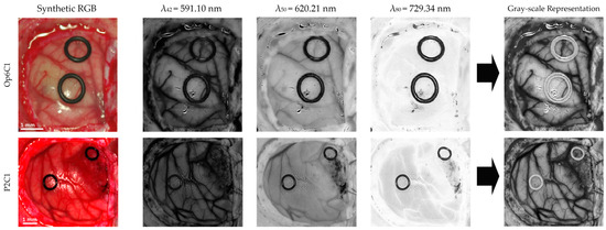 Firstly, three spectral channels are selected from the HS cube (, , and ), where the subscript of each wavelength indicates the number of the spectral channel in the spectral signature. These spectral channels are linearly combined following Equation (2) to obtain a gray-scale representation (I) of the HS cube where the blood vessels are highlighted (Figure 3). The selection of the most appropriate spectral channels and coefficients was performed empirically, evaluating the contrast of the image by visual inspection. The spectral channel was selected because it presents one of the absorption peaks of hemoglobin in the HS image dataset employed in the experiments. Previous works have shown that the hemoglobin concentration absorption peak is normally found between 500–590 nm [48,49,50]. As it can be seen in Figure 3, shows a high contrast between the brain tissue and the blood vessels, but the background (especially rubber ring markers) and the specular glare are indistinguishable from the blood vessels. In order to solve this, the spectral channel is included in the equation, since it provides a higher contrast between the blood vessels and background. In addition, a reflectance peak of the hypervascularized tissue was found in the spectral channel where differences between the brain tissue, background, and the blood vessels are highlighted. As previously mentioned, these spectral channels were linearly combined, obtaining the gray-scale representation image used for the blood vessel and parenchymal area detection (Figure 2A).