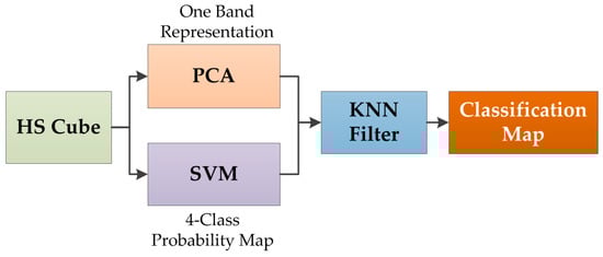 The results of the deep learning algorithms were compared with the results obtained by a spatial–spectral classification algorithm. This supervised algorithm has been already employed for the classification of HSI medical images [38], and it is only employed as a state-of-the-art comparison in this study. In this spatial–spectral algorithm, the HS cube is dimensionally reduced using a principal component analysis (PCA) algorithm to obtain a one-band representation of the HS cube. This one-band representation is used as a guide image to perform a spatial homogenization of the four-class probability map obtained by a support vector machine (SVM) classifier. The spatial homogenization is performed by a K-nearest neighbors (KNN) filter that improves the classification results obtained by the SVM algorithm [38,53]. Figure 4 shows the pipeline of the spatial-spectral supervised classification algorithm. The outcome of this algorithm is a classification map that takes into account both the spatial and spectral features of the HS images.