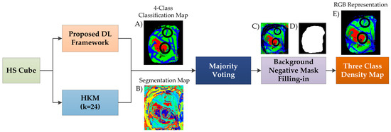 Finally, the three-class probability cube is used to generate the RGB density map where each pixel color value (red, green, and blue) is proportionally degraded using the probability values of each layer (Figure 5C). The parenchymal map (Figure 5D) obtained in the DL pipeline is also used at this point to exclusively identify the classification results obtained in the parenchymal area through a negative mask filling-in method, obtaining the final three-class density map (Figure 5E). The algorithm for generating the three-class density map was previously reported [38]. However, this paper uses the DL architecture instead of the supervised spatial–spectral classifier (PCA, SVM, and KNN filtering pipeline), as well as the addition of the parenchymal detection.