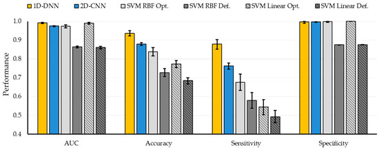 The algorithms were tested using eight HS images from six human patients with GBM tumor following the leave-one-out cross-validation method, where the HS data of the patient to be tested was not employed to train the algorithms. In order to evaluate the deep learning methods against traditional SVM-based machine learning algorithms, a binary classification, where only the tumor and normal samples of the database were employed, was performed. Figure 6 shows the average classification results obtained with the six different classification approaches. The SVM-based approaches with default parameters have been included to highlight the importance of the hyperparameter sweep procedure to improve the results. AUC, overall accuracy, sensitivity, and specificity metrics, as well as their respective 95% confidence interval, were computed using the bootstrapping method (see Table S2). The deep learning methods improve the accuracy and the sensitivity compared to the traditional SVM-based machine learning techniques. Particularly, the 1D-DNN achieved the best results, obtaining 94% accuracy, 88% sensitivity, and an AUC of 0.99. Compared to the best SVM-based method, an improvement of 6% in the accuracy is achieved.