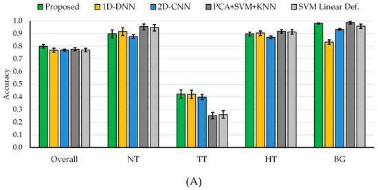 However, when the four-class dataset is used, the results obtained by both DL techniques are quite similar. Figure 7 and Tables S3 and S4 show the average classification results of the multiclass classification with the 95% confidence interval (shown within the error bar). In this case, the overall accuracy obtained with the 2D-CNN and the 1D-DNN are similar to the traditional SVM-based approaches; however, the sensitivity of the tumor class has been improved by ~16% when using the DL approaches. In this particular case of in vivo tissue, it is a challenging task to achieve a high sensitivity in the tumor class.