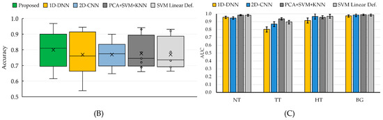 For the binary classification scheme, the improvement in the sensitivity performance of the DNN compared to all of the SVM-based algorithms was found to be strongly statistically significant (), using a paired, one-tailed Student’s T-test. This relationship was not found for the CNN compared to all of the SVM-based algorithms, despite the increase in the average performance. Therefore, the method proposed in the paper used the DNN approach. Moreover, the difference in performance between the DNN and CNN was not found to be statistically significant. Additionally, for the multiclass classification scheme, the tumor accuracy performance improvement of the proposed algorithm was found to be marginally statistically significant compared to the DNN alone, PCA + SVM + KNN, and SVM approaches (), using a paired, one-tailed Student’s T-test.