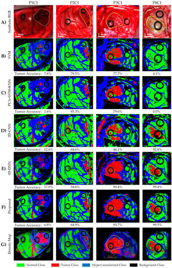 Classification maps of four of the test hyperspectral (HS) images and their respective tumor accuracy below each map. (A) Synthetic RGB image with the tumor area surrounded by the yellow lines. (B–F) Multiclass classification maps obtained with the support vector machine (SVM), principal component analysis (PCA) + SVM + K-nearest neighbors (KNN), 2D convolutional neural network (2D-CNN), one-dimensional 2D deep neural network (1D-DNN), and the proposed framework, respectively. Normal, tumor, and hypervascularized tissue are represented in green, red, and blue colors, respectively, while the background is represented in black. (G) Density maps generated using the surgical aid visualization algorithm with the optimal threshold established for the tumor class. In these maps, the colors have been adjusted depending on the probability values obtained after the majority voting algorithm.