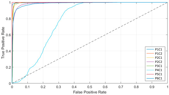 Finally, the ROC curves obtained from the basic approaches (Figure 7C and Table S4) show that each class has an optimal operating point where the algorithm is able to classify the samples with high accuracy. These high AUC values indicate that for the majority of cases, there is a classification threshold (operating point) that can achieve accurate classification. However, this optimal threshold has a large variation depending on the image that is classified. As can be seen in Figure S1 and Table S5, the AUC metric is unaffected by the class distribution during the metric computation. The AUC results achieved without the bootstrapping method are within the 95% confidence interval. Furthermore, Figure 9 shows the ROC curves of the tumor class obtained for each image of the validation dataset by using the 1D-DNN, where it is possible to observe that all the images (except P1C1) offer practically optimal ROC curves. In this sense, the development of a surgical aid visualization system is based on the use of the optimal operating point to generate the density maps. Figure 8G shows the density maps of each test image obtained with the proposed surgical aid visualization algorithm (Figure 5), where the optimal operating point was employed to classify each pixel. In these maps, the colors of each class were degraded, depending on the probability values obtained for each class in each cluster. Hence, it is possible to reveal, in some cases, tumor areas that cannot be seen directly in the classification map, as well as remove some false positives produced in the supervised classification.