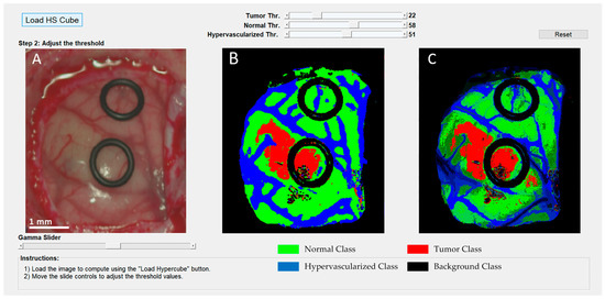 Since the automatic computation of the optimal operating point cannot be performed during the surgical procedures due to the absence of a gold standard of the undergoing patient, the surgical aid visualization system was developed based on the manual selection of this operating point. Using the developed user interface (Figure 10), the operating surgeon is able to easily determine the optimal result on the density map (Figure 10C) by manually adjusting the threshold values of the tumor, normal, and hypervascularized classes. These threshold values establish the minimum probability where the pixel must correspond to a certain class in the classification map generated by the 1D-DNN (Figure 10B). After that, the overlapping and the majority-voting algorithms are computed to generate the updated density map. This user interface combines the information provided by the HSI processing and the expertise and knowledge of the operating surgeon.