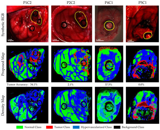 Four of the HS images employed to compute the evaluation results were acquired after the beginning of the resection. P1C2, P2C2, P4C1, and P5C1 are images captured when part of the tumor had been resected from the superficial tumor (in the cases of P1C2 and P2C2), or when the normal brain of the surface was resected to reveal a deep layer tumor (in the cases of P4C1 and P5C1). The synthetic RGB images and the classification maps achieved for the proposed DL framework as well as the correspondent density map are shown in Figure 11. As it can be seen in this figure, the procedure carried out to perform the resection of the tumor produced several effects in the exposed brain surface (extravasated blood, increase of the vascularization in the surrounded normal tissue, burn marks or presence of surgical serum employed to clean the exposed area) that could produce misclassifications of the tumor pixels. The classification map of P1C2 presents false positives in the left part of the image, where in P1C1, a rubber ring marker was located that was histopathologically diagnosed as normal brain. The effects produced by the resection tools in this area generated the misclassification of the surrounded pixels in this area. Extravasated blood present in the tumor area also generated problems in the classification result of P2C2. Although the surface of the brain was cleaned before the HS image acquisition, the time involved in the acquisition process (~one minute) creates the opportunity for extravasated blood in the image if the tumor area is highly vascularized. This produces misclassifications, especially between the hypervascularized class and the tumor class. Finally, P4C1 and P5C1 present deep-layer tumors, and it was more difficult to get high-quality images due to the limitations of the intraoperative HS acquisition system. Only a few tumor pixels could be accurately labeled with high confidence from these images, as it can be seen in the gold standard reference maps presented in Figure S2. Particularly, the tumor area of P5C1 was captured with a non-optimal focus, which led to the spectral signatures of the tumor area being misclassified with background pixels. In addition, in this classification result, it is possible to observe how the burn marks generated due to the resection tools induces misclassifications between the surrounded normal tissue and the tumor class. In summary, Figure 12 presents the class accuracy results achieved for each HS image in the test dataset using the proposed method. In these results, it is possible to observe that when employing high-quality HS images of the tumor exposed in the brain surface (P2C1, P3C1, and P6C1), the accuracy of the tumor detection is statistically significant. Furthermore, the accuracy of the remaining classes (normal tissue, hypervascularized tissue, and background) is optimal in the majority of the cases. The main problem found here is in the classification of images that were captured under non-optimal conditions or captured after the beginning of the resection, which produces several effects in the tissue that surrounds the resected area. As stated before, the visual analysis of the classification maps obtained with the proposed method (Figure 10 and Figure 11) shows that false positives are clearly obtained in some pixels outside the tumor area (surrounded by the yellow line). P1C1, P1C2, or P5C1 are clear examples. On the other hand, false negatives are also found in the results, where normal tissue or hypervascularized tissue is identified within the tumor area. However, due to the multiform nature of the GBM tumor, these results should be validated through histopathological analysis in further experiments.