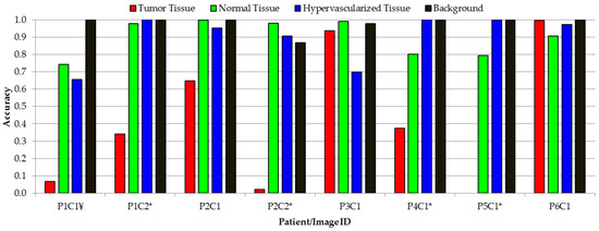 Class accuracy obtained with the proposed method for each test HS image. (*) Indicates the HS images acquired after beginning the resection. (¥) Indicates the image acquired with the tumor exposed in the surface, but under non-optimal illumination conditions.
