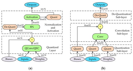 In this section, we discuss the way to convert the dense floating-point multiply-accumulate convolutional operations into efficient integer operations under the symmetry quantization scheme. Considering the similarities between the fully connected layer and convolutional layer, we only derive the quantized calculation method for the convolutional layer here. The final conclusion for the fully connected layer is given directly. The convolution is defined as Equation (4) [38], where and indicate the input feature maps with a size of H × W and kernel matrices with a size of K × K, indicates the output feature maps of the convolutional layer, and indicates the number of input channels in .