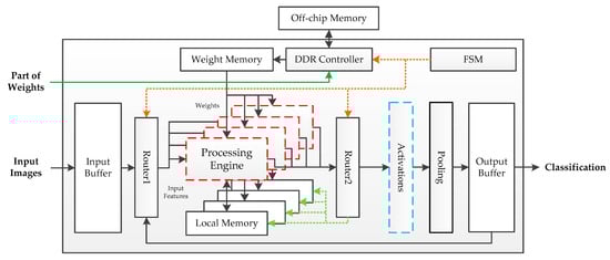 The fundamental hardware implementation architecture is shown in Figure 3. The off-chip memory is a Double Data Rate (DDR) SDRAM, which is used to store parameters. Except for the first fully connected layer, the volume of the parameters is tiny. Thus, the weights of the first fully connected layer are put into off-chip storage after power-on, while other parameters are stored in the on-chip Read-Only Memory (ROM). Pipeline processing is adopted in this architecture. Four PEs are used to achieve the calculation, each with a local memory to accumulate the intermediate results. When images are fed into the buffer, the finite state machine (FSM) controls the system to enter working mode. The processing engines get features though router1 and read weights from the weight memory. The output data flow process engines are determined by router2. If the current calculation results are layer responses, these results will be sent into the activation module; otherwise, they will be stored in the local memory for overlap-addition. An output buffer is used to receive the feature maps from the pool module during the inference phase and transmit the final classification prediction at the output stage. While the above architecture performs well in the deployment of the benchmark framework, it employed floating-point operations for implementation, which results in high logical resource and memory consumption.