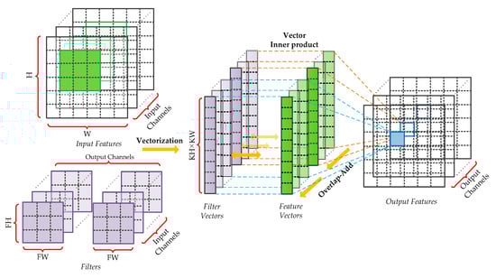 In this section, we focus on designing the PEs for the hybrid-type inference to reduce the logical resource consumption and memory footprint. An efficient calculation method for the convolutional layers and the fully connected layers is introduced in our previous work [33], which is composed of vector inner products and overlap-additions. As shown in Figure 4, the patches of input features and filters are converted to vectors first. Then, the vector inner products, between input vectors and the corresponding filter vectors, are performed to get the intermediate results. Finally, these results are accumulated using the overlap-add method to obtain the output pixel. In this paper, the design of hybrid-type PEs uses the same method. Moreover, as the quantized framework adopts Relu activation and Max pooling without BN, the quantization, and de-quantization operations can be merged to optimize the design of PE. Since the symmetric quantization is used, the sign bit of quantized values is consistent with the corresponding real values and the magnitude relation between pixels has not been modified. Therefore, the latter quantization sub-layer can be put before the activation function and the pooling layer. Considering that both quantization and de-quantization involve floating-point multiplication, the hardware design can be optimized by fusing the same operations. To be specific, the adjacent scaling factors are converted into a new value and calculate the floating-point input feature by only one multiplication, which is shown in Figure 5.