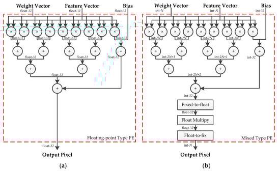 (a) Structure of the fused-layer floating-point-type PE. (b) Structure of fused-layer hybrid-type PE.