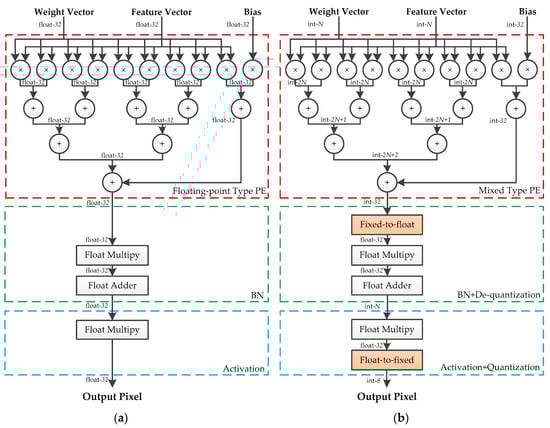 Most of the current state-of-the-art convolutional neural networks adopt BN to accelerate training and LeakyRelu Activation to solve the problem of the vanishing gradient. However, the symmetric quantization scheme is unsuitable for approximate calculation of these functions. BN requires high computational precision and the outputs of LeakyRelu need to be rescaled using quantization. Therefore, in this paper, the integer/floating-point hybrid-type inference method is adopted. In this method, the convolutional and fully connected layers are calculated by using signed integer data type, while the floating-point normalizations and activations are maintained. Figure 1a shows the hybrid-type inference. When applying this method in hardware implements, adjacent identical operations are merged to optimize the hardware design. To be specific, the floating-point multiplications of BN and de-quantization are fused into one operation and perform the same optimization for activation and quantization. This optimization is helpful to reduce the use of the floating-point multiplier. The hardware details will be discussed in Section 4.2.