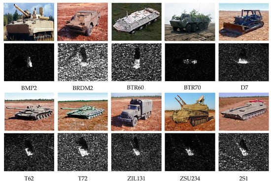 The proposed inference method is evaluated on the MSTAR dataset [34], which was jointly provided by Defense Advanced Research Projects Agency (DARPA) and Air Force Research Laboratory (AFRL). The MSTAR dataset was composed of massive ground military vehicle chips of ten types and collected by an X-band Synthetic Aperture Radar (SAR) in one-foot resolution spotlight mode, with full aspect coverage. All the chips were extracted from the original SAR image and had a fixed size of 128×128. The sample vehicle chip of each type, with the corresponding optical image is depicted in Figure 8. The MSTAR dataset is divided into two parts: 2747 training samples and 2425 testing samples. The statistical result of each part is listed in Table 3. In the fundamental architecture, the image has a fixed size of 126×126, which is determined by the network. Therefore, central cropping is adopted on the images to meet the requirement. As the target is in the center of the images in the MSTAR dataset, the clipping method would not cause a serious loss of information.