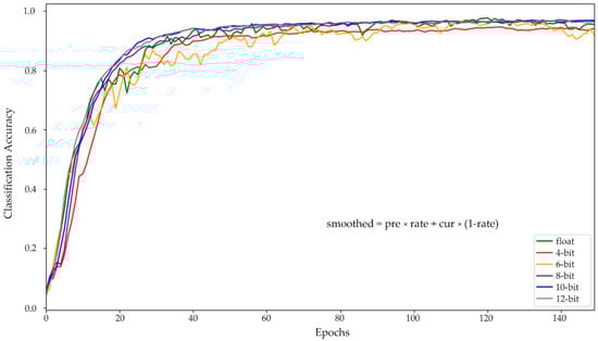 Figure 9 shows the test results for each epoch for all the aforementioned models. To clearly reflect the test results, the formula, described in the figure, is used to smooth the curve, and the smoothing rate is set to 0.65. As can be seen from the results, floating-point networks achieve nearly best performance at about 50 epochs, while all the quantized networks require about 130 epochs. This result indicates that quantized CNN models need to be trained for a longer period to achieve the best performance.