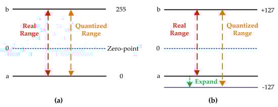 We conducted another set of experiments to compare the proposed quantization scheme with [32]. The quantization scheme with zero-point and co-design training approach proposed in [32] are reproduced under the Pytorch framework. Five data formats are used to quantize the fundamental network. The training platform and details of the training parameters are the same as in the first set of experiments. The experimental results, tested on the evaluation set of all quantized networks, are listed in Table 7. The scheme in [32] gains better results, which are 1.36%, 1.08%, 0.56%, 0.44% and 1.05% higher than the proposed scheme, at 4, 6, 8, 10, and 12-bit, respectively. This can be interpreted as higher quantization resolution caused by smaller quantized range, which is depicted in Figure 10. Since scheme in [32] has zero-point (8-bit unsigned integer) to represent the real value of 0, it is unnecessary to expand the dynamic range to distinguish the sign bit for both weights and features. With the shrinking range, the real values get a refined representation and computational error is reduced. However, this scheme involves more calculation than ours when performing the optimization of hardware design. The quantization strategy adopted by [32] can be expressed as Equation (29), where Z denotes the zero-point.