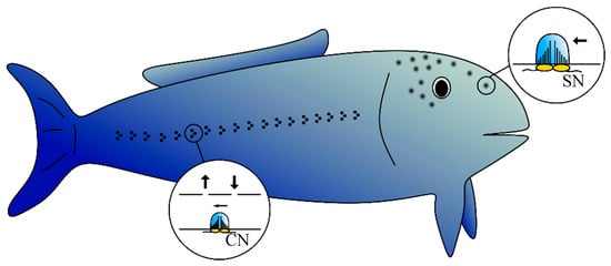 The fish’s lateral line (see Figure 1 for an example structure) consists of hundreds of neuromasts distributed across its head and body [3]. A neuromast is comprised of hair cells embedded in a gelatinous cupula. Each hair cell has a hair bundle on the outer cell surface that consists of a kinocilium and up to 150 shorter stereovilli [2,4]. Fluid flow deflects the cupula and thus bends the hair, and the cell emits a neural signal. The neuromasts in the lateral line can be classified into two types: superficial (SNs) and canal (CNs) neuromasts. While SNs occur on the surface of the skin, CNs are located between pairs of pores in a canal under the skin. SNs measure the fluid flow velocity of the bulk water flow, and CNs record pressure differences between the canal pores [5].