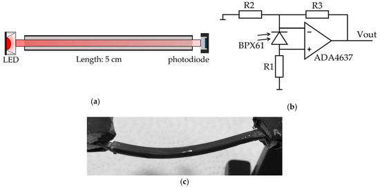 The LED is driven by a constant current source of 100 mA and the op-amp has a maximum symmetric supply of 15 V. The operation principle is shown in Figure 2a: Red light is coupled into the waveguide by an LED (XP-E2, Cree, Durham, North Carolina, USA) after being focused by a lens (18°, Carclo Optics, Aylesbury, UK). At the other end of the waveguide, the remaining light is detected by a photodiode (BPX61, Osram, Munich, Germany). The fiber has a length of 5 cm, and a square cross-section of 3 × 3 mm2.
