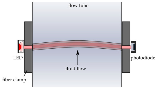 Schematic description of the sensor and the sensor mechanism in the presence of fluid flow. The fiber is integrated into a flow tube while fixed on each side with fiber clamps. Fluid flow bends the waveguide and the light intensity at the output decreases.