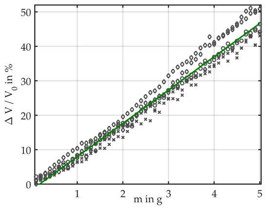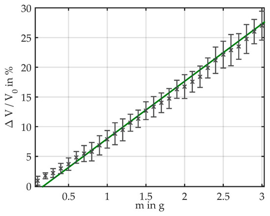 For each bending mass, we calculated the light loss relative to the reference voltage V0 of the unbent fiber. We obtained the best results when using V0 measured at the start of a measurement cycle. Figure 6 shows the data of six measurement cycles and illustrates that the sensor shows a linear behavior toward bending with masses. The linear fit has a slope of 9.67, which corresponds to the sensitivity of the sensor. The average light loss was calculated for each bending mass, which is illustrated together with the standard deviation in Figure 7. It provides a more detailed view of the measurement data and comprises bending masses between 0 g and 3 g. The measurement results are plotted as relative light loss over the attached mass. The results show that the light loss is linearly dependent on the induced bending. At a mass of 5 g, the mean light loss is 46.7%; therefore, the average loss for Δm = 0.1 g amounts to approximately 1%. The standard deviation increases with the attached mass.