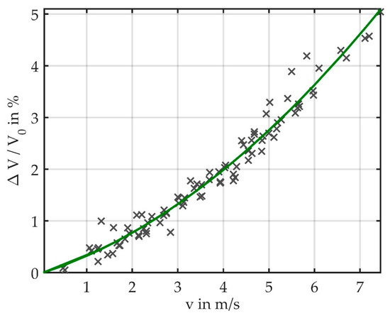 Although the same set of supply voltages was applied in each measurement, the flow velocities measured by means of the testo constant temperature anemometer (CTA) scattered (see Figure 8) due to the significant measurement error of the testo device. Between 0.1 m/s and 2 m/s, the measurement error amounts to 0.1 m/s + 5% of the result; between 2 m/s and 15 m/s it amounts to 0.3 m/s + 5% of the result. We thus could not calculate confidence intervals, the results however show that the light loss depends quadratically on the flow velocity.