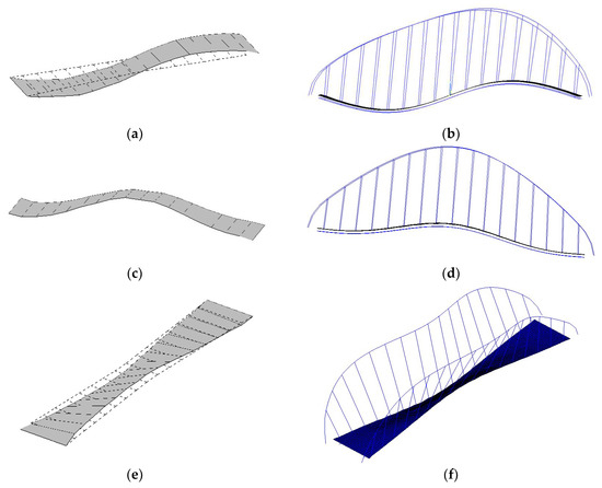 The bridge responses are further analyzed by the AMA algorithm, as stated in Section 2. The modal parameters of the physical mode, identified by the ambient vibration experiment and calculated by the numerical simulation, are listed in Table 1. Furthermore, the visualized mode shapes identified by the LabVIEW toolkit [26], are shown in Figure 8, Figure 9 and Figure 10.