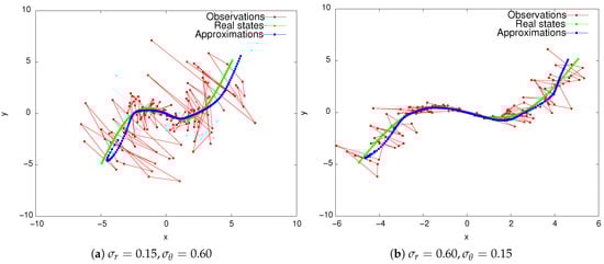 - Judd, K.; Stemler, T. Failure of sequential bayesian filters and the success of shadowing filters in tracking of nonlinear deterministic and stochastic systems. Phys. Rev. E 2009, 79, 066206. [Google Scholar] [CrossRef] [PubMed]