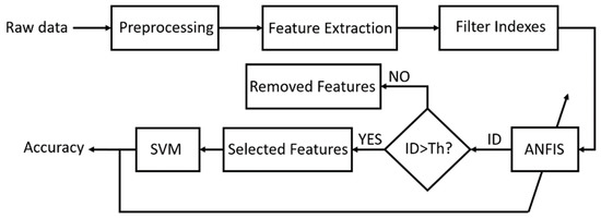 The proposed approach for feature selection is based on combination of filter and wrapper methods using ANFIS. Using parameter adjustment algorithms, ANFIS can help to select the best features based on dynamical behaviors of raw data. Figure 1 shows the structure of the proposed method. In the following sections, different parts of the proposed method have been explained.