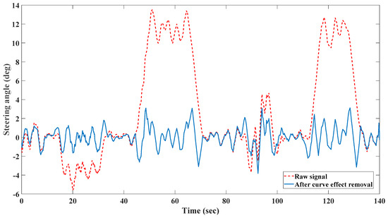 Steering wheel angle signal is dependent to the road geometry and curvature. In the straight sections of the road, steering wheel signals only consist of lane-keeping adjustments of steering by drivers. In contrast, steering signals in curved sections consist of road geometry effects. As the test scenario includes both straight and curved sections, the effect of road curvature on steering signal should be removed in sliding windows to detect the drowsy states in drivers [26]. This was performed by applying the following equations: