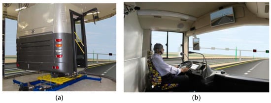 Experiments were performed using a bus driving simulator (BI301Semi) at the K. N. Toosi University of Technology. In this simulator, three high-resolution 3D video projectors have been employed to produce a field of view of 180°. In order to simulate road conditions, several pneumatic actuators have been exploited and an electric force feedback has also been used to provide steering wheel torque [36]. Figure 4a,b show the external and internal views of the used driving simulator, respectively.