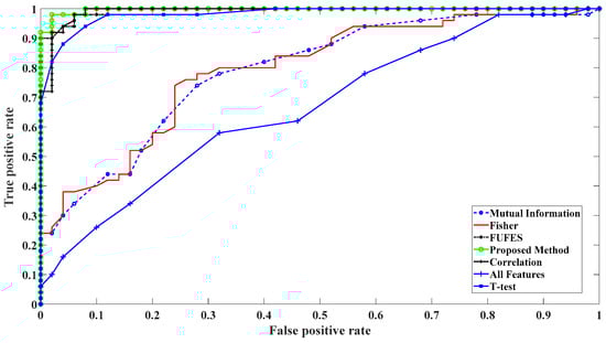 In order to evaluate the proposed method, its accuracy has been compared with other features selection methods in Table 5. Our dataset has been used to implement on proposed method in [23], where the parameters of fuzzy membership functions were constant. Table 5 demonstrates that our method outperforms the suggested method in [23]. Receiver Operating Characteristic (ROC) has been also applied to compare the results of the proposed method with other feature selection algorithms (Figure 6). The Area Under this Curve (AUC) is between 0 and 1 and AUC with the maximum value corresponds to a perfect classifier. Figure 6 shows that the proposed feature selection algorithm can improve the classifier performance. When all of the features have been used as classifier inputs, redundancy between extracted features can increase the false positive rate and AUC is the lowest value in comparison with other methods. Accuracy and AUC of the different methods have been compared in Table 5.