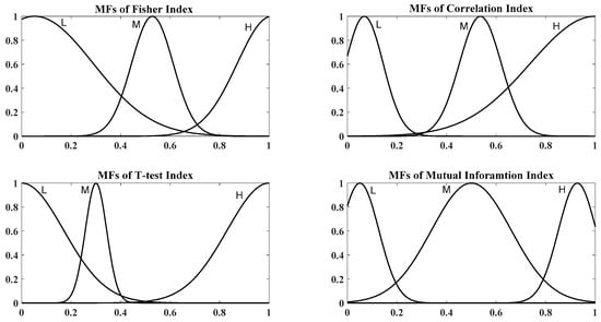 Final membership functions; upper left: Fisher index, upper right: Correlation index, lower left: T-test index, and lower right: Mutual information index.