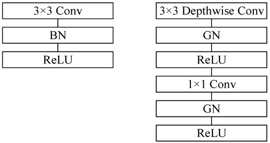 Novel network architecture based on the MobileNet model [26] is utilized in this paper. In the conventional MobileNet model shown in Figure 4, the batch normalization (BN) method is dependent on batch size, BN’s error increases rapidly when the batch size becomes smaller. To solve the impact of batch size on the model, the group normalization method [27] is utilized in this paper, shown as