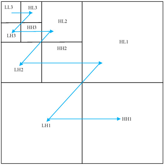 The spatial direction tree structure expressed in Figure 8 is utilized in this section to recombine image wavelet coefficients. In the spatial direction tree structure, each node is represented by coordinates, which are denoted as , and the coefficient of root node is denoted as .